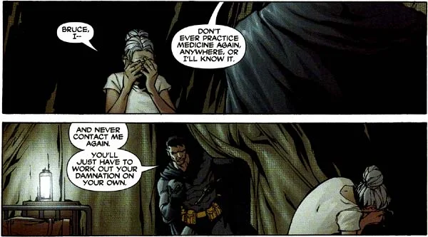 During the War Games storyline (2004-2005) Dr. Thompkins treats a critically injured Stephanie Brown (Spoiler, Robin). When Batman comes to see Stephanie, he discovers she has died. He later learns that Dr. Thompkins let Stephanie die to teach Bruce a lesson about using children in his war on crime. Bruce tells her to stay in Africa where she went to do missionary work. Bruce tells her he considers her a murderer now and if she returns to the US he will arrest her.
