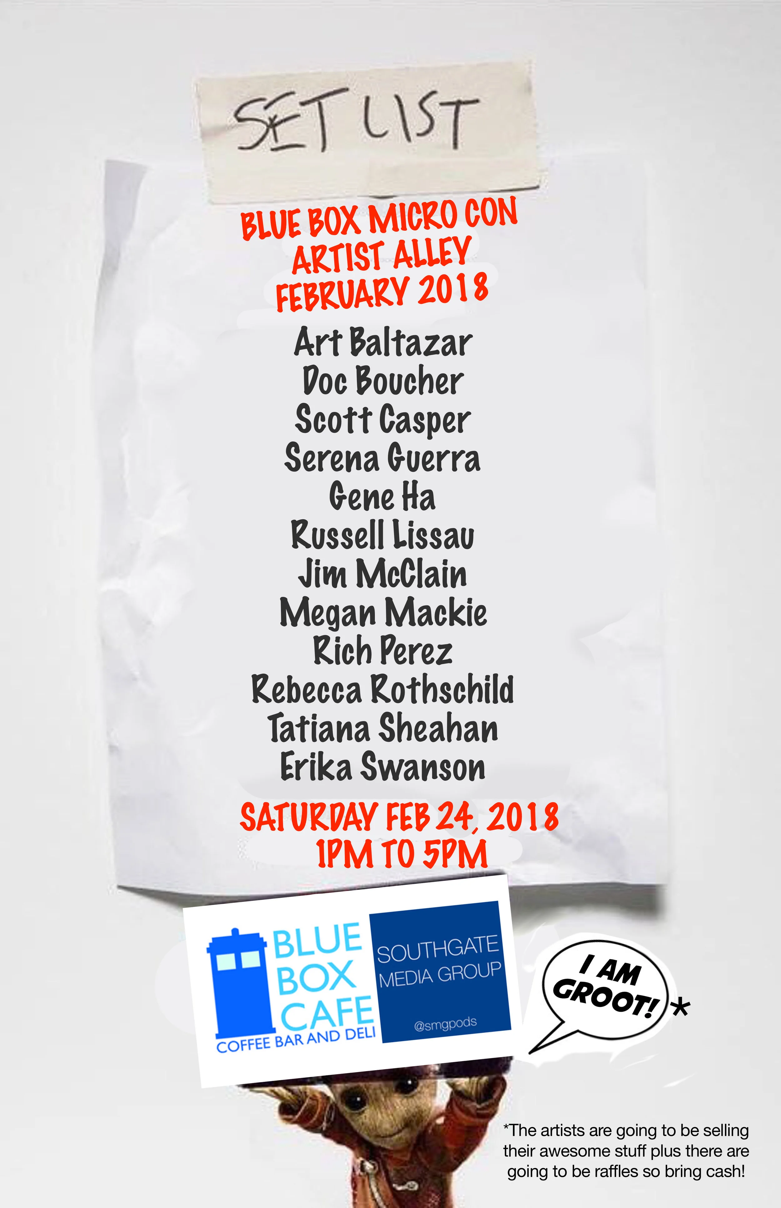 We had to reschedule this month's Blue Box Micro-Con (originally scheduled of the 10th) due to weather which brought about a few line-up changes. Fret not, we'll make sure we hold another Artist Alley event very soon so Steph, Tom and Dave can all take part. Make sure to watch here for updates and announcements.